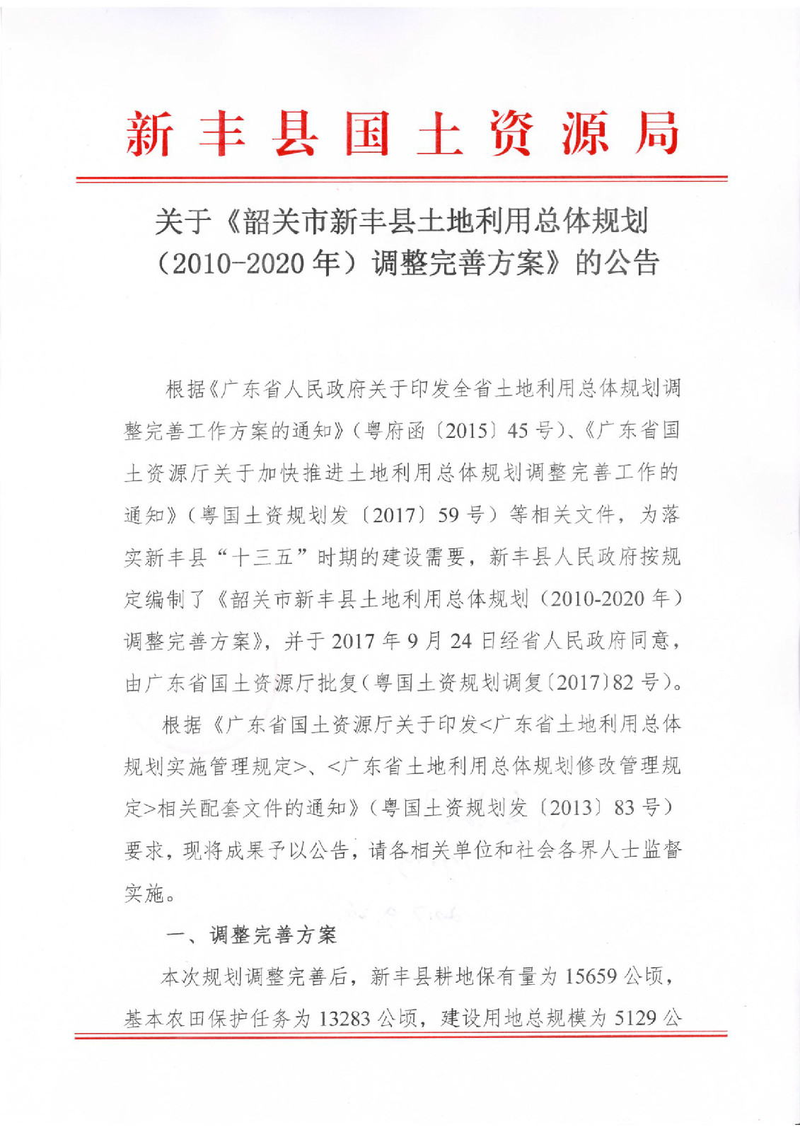关于《韶关市新丰县土地利用总体规划(2010-2020年)调整完善方案》的公告