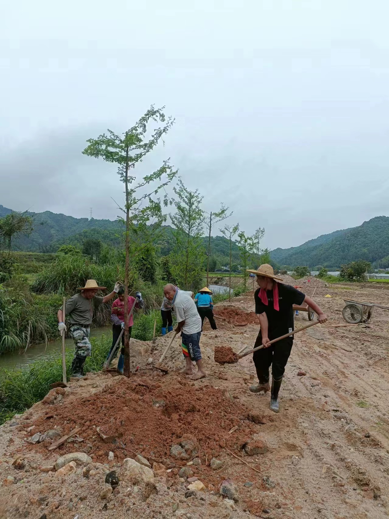 梅溪村紧抓当前有利时节和“百千万工程”典型村建设契机,一是合理统筹、迅速行动,掀起“植绿”“插绿”热潮,在原有《梅溪村村庄绿化美化规划图》基础上,以乡村“四旁”“五边”为重点,深入村主干道边、河流边沿等区域进一步摸排出了12000平方的可绿化空闲生态板块,适宜种植树种类等,为及时增绿补绿提供详实依据。二是党群共建,携手添绿。在敲定绿化方案后,梅溪村积极投工投劳,以干部带头干,群众共参与的形式,4月18日积极发动党员干部、志愿者、妇女群众26人,突出村道、河岸及功能性场所绿化,因地制宜种植了300棵水杉,100棵红花油茶,切实增加了梅溪生态发展“含绿量”,实现村在林中,房在绿中。
