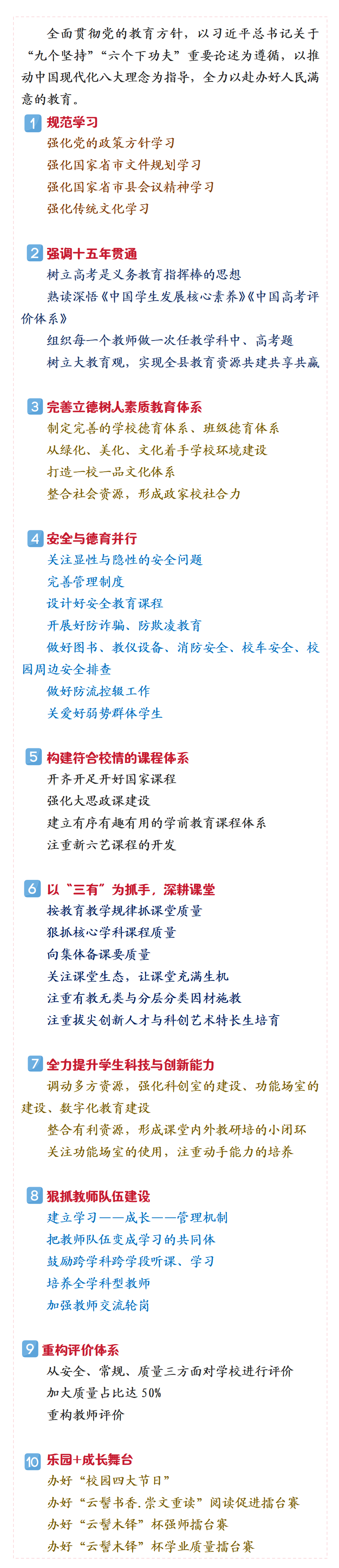 “2024年是教育系统规范提升年,是启动创建国家义务教育优质均衡发展县工作之年,我们要紧紧把握质量的生命线,全力以赴向课堂、向常规、向教师要教育质量。‘云髻书香.崇文重读’阅读促进擂台赛,‘云髻木铎’杯强师擂台赛、学业质量擂台赛将全面开赛……”