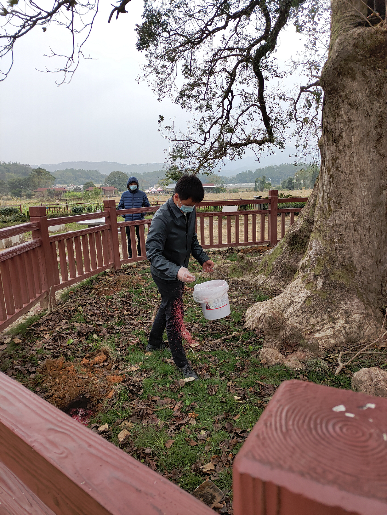 专家现场配置杀虫药剂,给古树打“吊针”,药剂能够穿透树皮直达病灶,通过对树身喷洒药剂、根部土壤消杀、树干输液杀虫等措施进行多方位除治,从而更全面、快速的杀死害虫,将病虫危害降至最小。