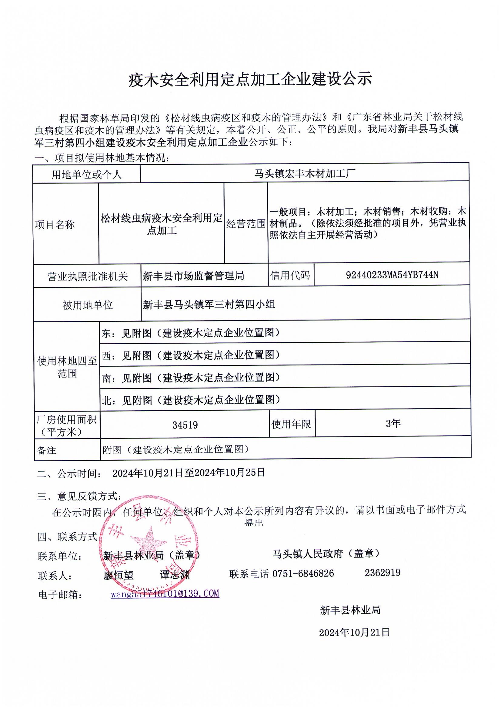 2024年马头镇宏丰木材加工厂申请疫木定点加工公示