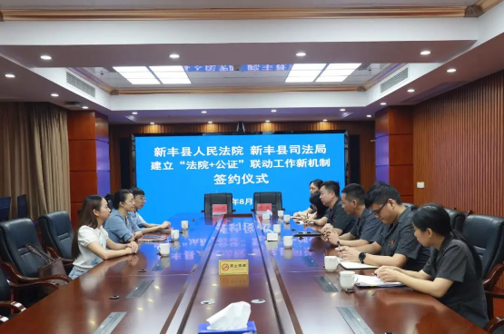 8月31日,新丰县人民法院与新丰县司法局联合举行《关于建立“法院+公证”联动工作新机制实施方案(试行)》签约仪式。县法院党组书记、院长廖海岷,县司法局主要负责同志出席仪式并见证签约。