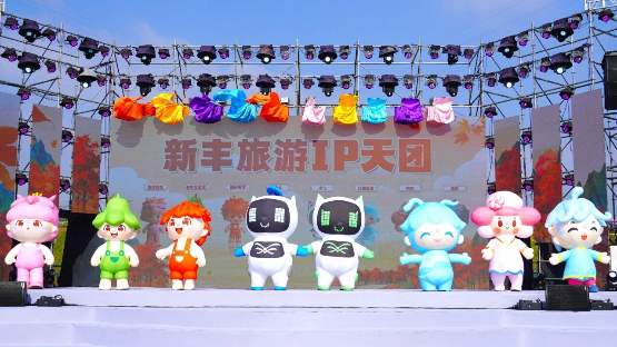 开幕式在铿锵有力的潮汕英歌舞中热烈开场,传统非遗与红枫胜景碰撞出激情火花。随后,新丰旅游IP天团首次集体亮相。8位萌趣形象——“枫叶哥哥”“樱花妹妹”“佛手瓜宝宝”“江源宝宝”“梅梅”“泉泉”及“丰飞侠-小丰、小飞”,共同成为新丰文旅的生动名片。主题歌曲《丰飞侠》首次唱响,该曲专为新丰低空经济发展创作。
