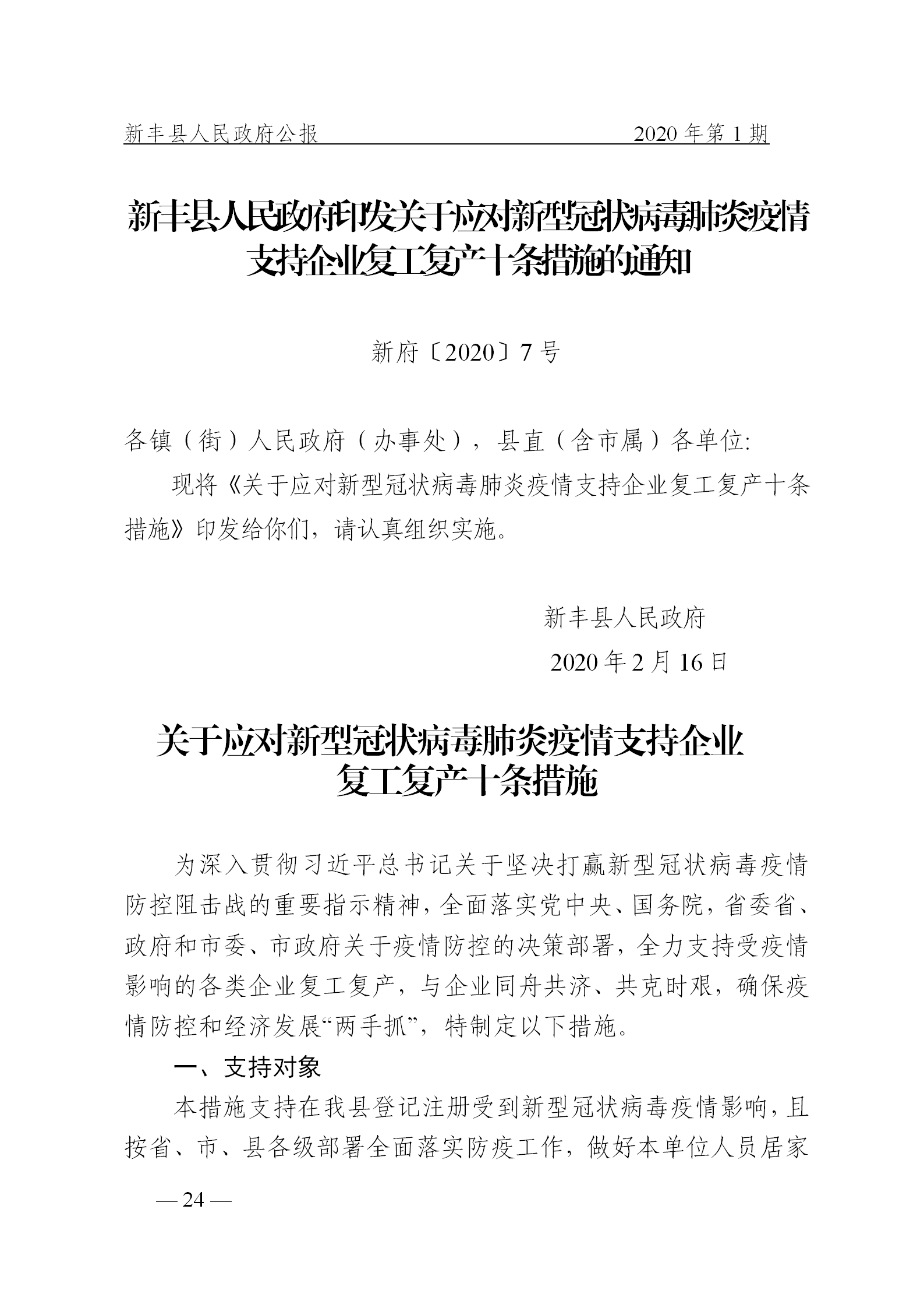 新府〔2020〕7号新丰县人民政府印发关于应对新型冠状病毒肺炎疫情支持企业复工复产十条措施的通知.doc