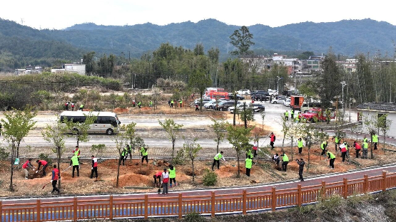 在梅坑镇大岭村合水口植树点,参加活动人员热情高涨、干劲十足,严格按照植树规范操作,细致完成挥锹培土、扶树正苗等环节,确保苗木栽种质量和后期成活率。今栽一株绿,明览万目春。一棵棵新苗迎风挺立,在春日中焕发勃勃生机,让绿色成为新丰高质量发展的鲜明底色。